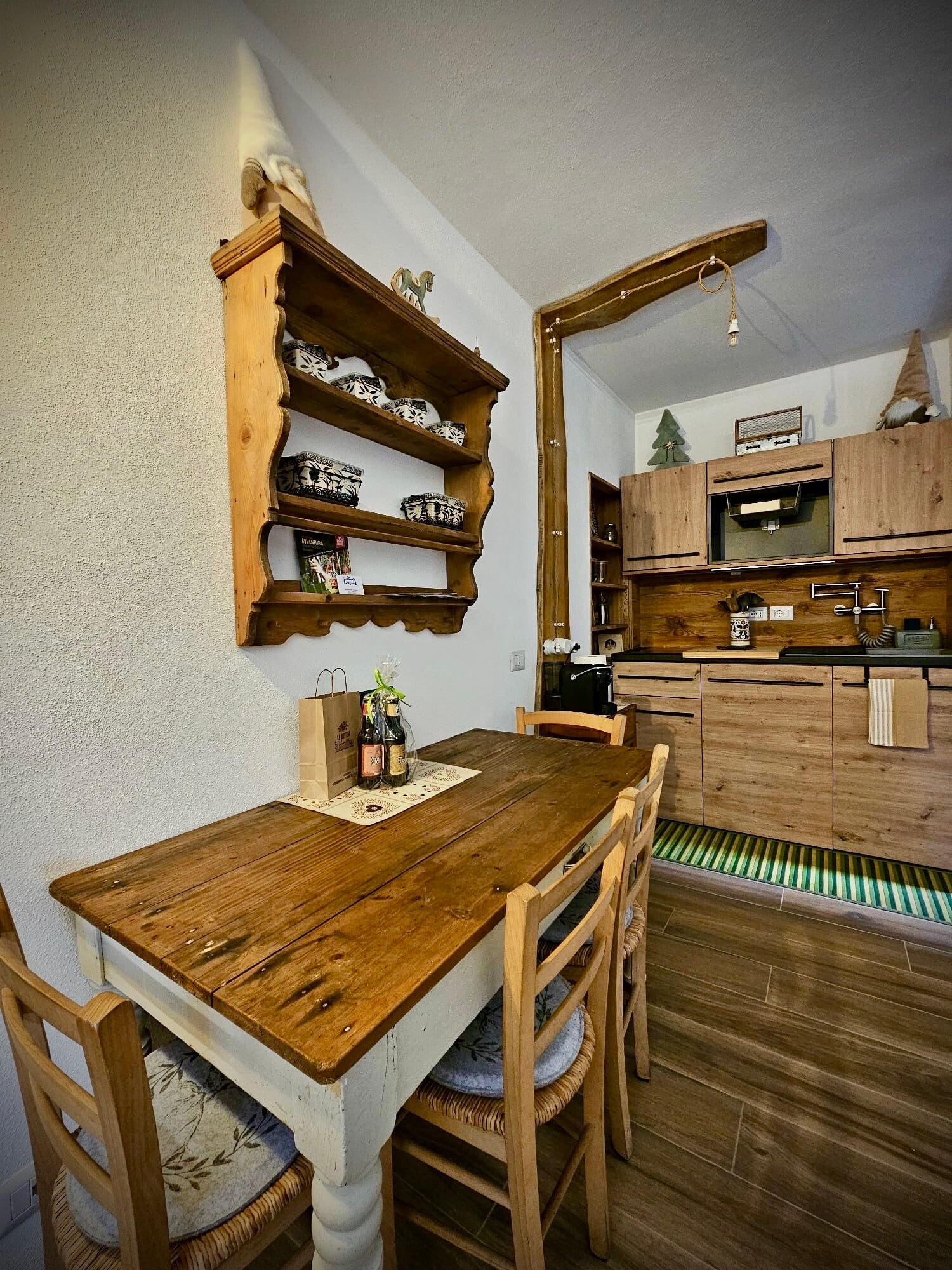 Atmosfera rustica: legno, pietra e semplicità che raccontano la vita alpina.